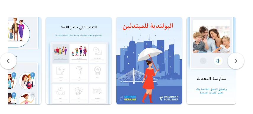 كما يقدم التطبيق أنشطة متنوعة مثل وصف الأشخاص، تعلم أسماء أجزاء الجسم، وحتى المواضيع المتعلقة بالسياسة والصحة.